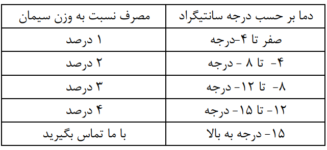 بسته به دمای زمان بتن ریزی و طرح اختلاط بر اساس جدول زیر تعیین می گردد: